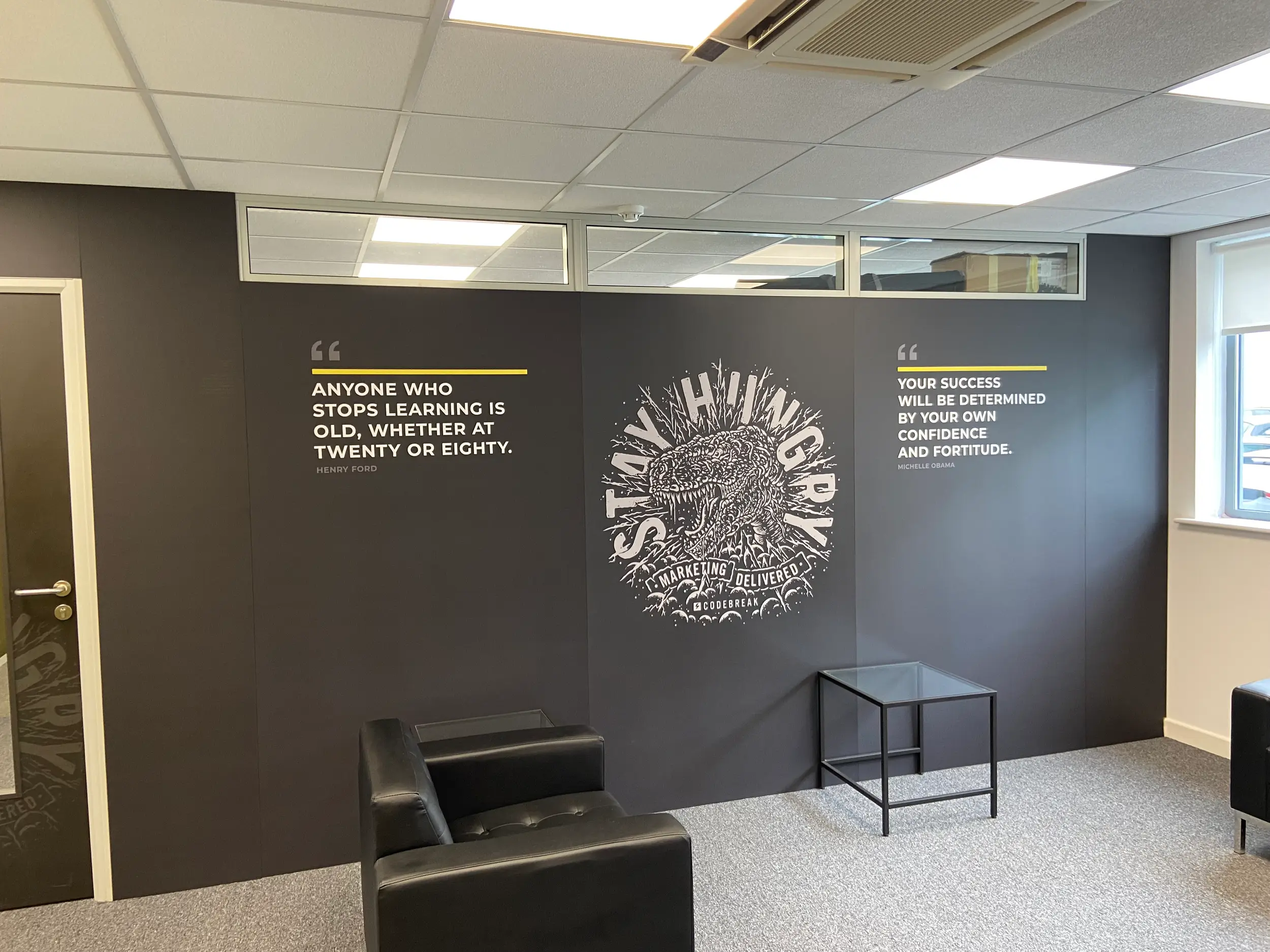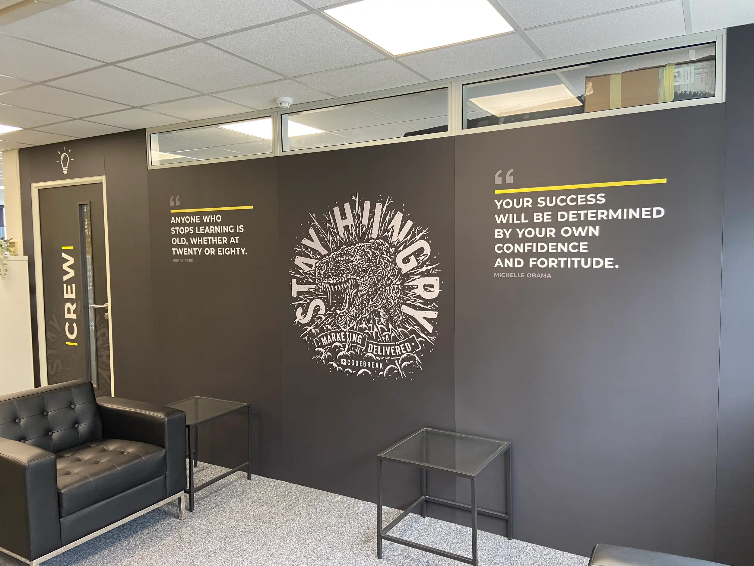 “We approached City Install with a job to wrap one of our internal offices with graphics and famous quotes to replace some failed signage from another company. A job the other company had tried to rectify several times. As a marketing agency, it was vital this looked spot on and represented our brand. City Install arranged for a surveyor to come and look at the options and then present us with the best solution. Following the survey, it was a simple process right the way through to install and final checks. For any business that takes their image seriously, City Install are the go-to signage company around. They come highly recommended from Codebreak.”